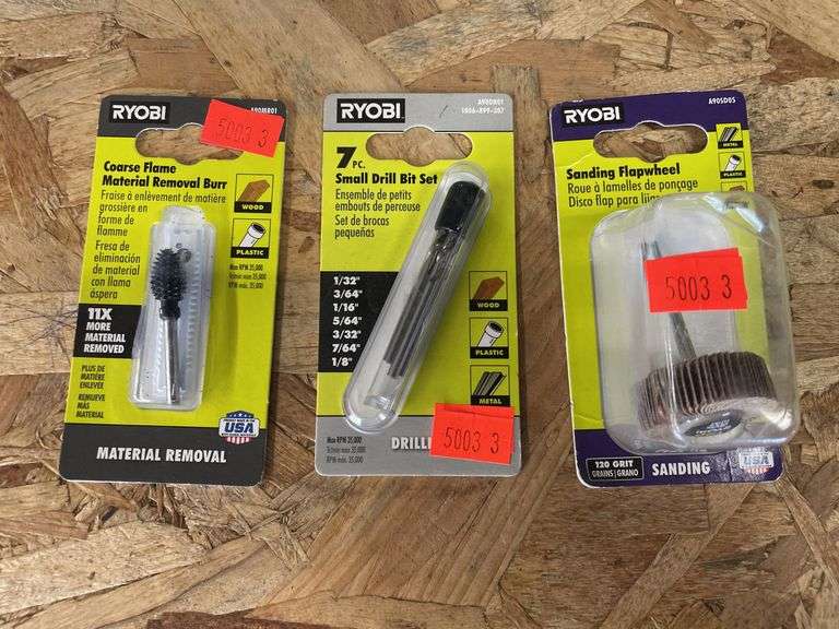 LOT 5003 - Ryobi Coarse Flame Material Removal Burr, 7pc. Small Drill Bit Set And Sanding Flapwheel