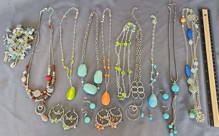 9- Silver tone necklace assortment including, Avon, beads, 5- pairs of pierced earrings, 1- Silver tone charm bracelet