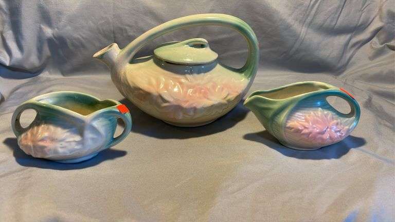 LOT 175 - McCoy pottery pink & blue daisy tea set including teapot, cream & sugar