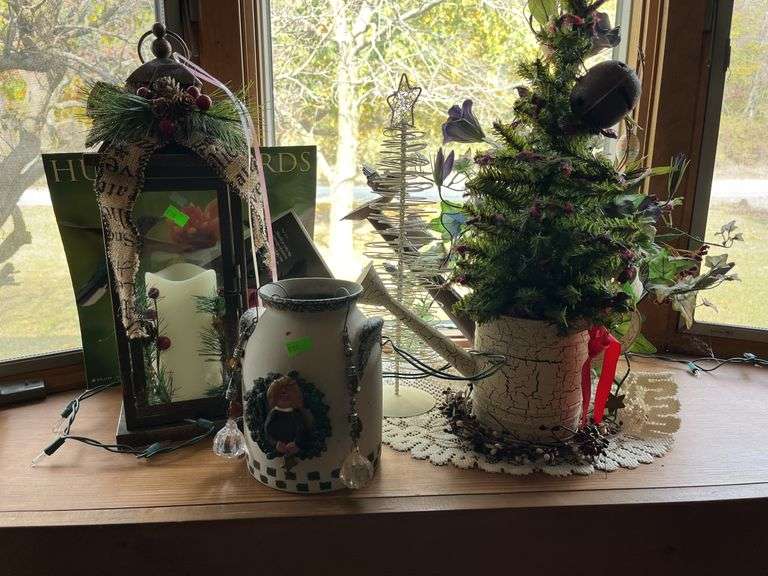 Lantern with battery candle 16”, pottery cover, Christmas tree 19”, wire Christmas tree 15”, watering can with floral arrangement