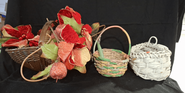 Woven baskets, candlesticks, faux holiday decor foliage