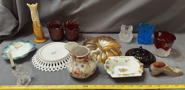 Toothpick holders, candle holders, pin cushion, vase, creamer, souvenir plate, iridescent clover dish, ruby flash cup