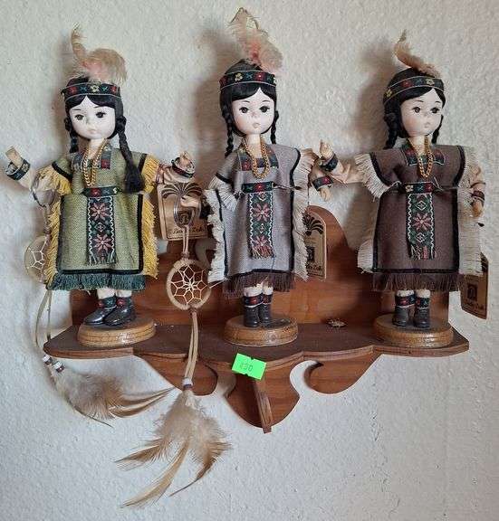 LOT 430 - Wood Decor Shelf with 3 Native American Bradley Dolls 13”