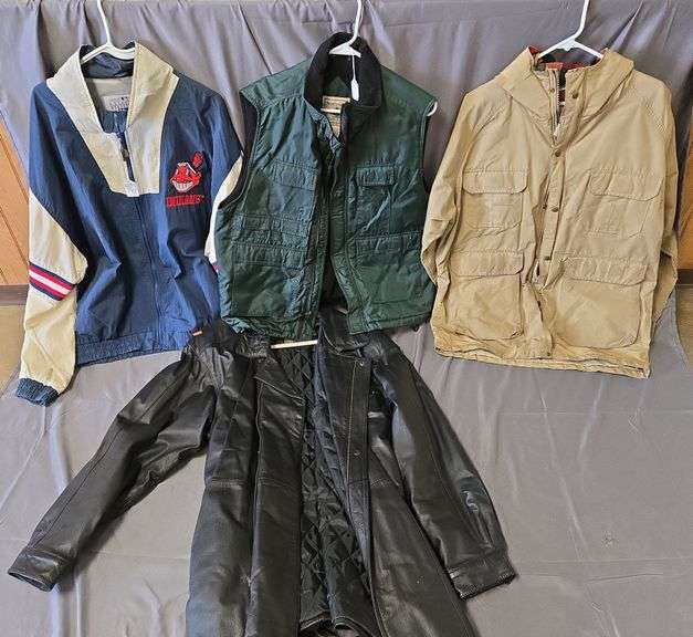 Cleveland Indians jacket XL, Northwest territory vest M, Woolrich coat L, Azia leather jacket size unknown