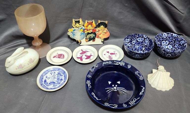 LOT 8077 - Pink Glass Compost, Cat Bowl , Rabbit small dishes, Rabbit Covered Dish