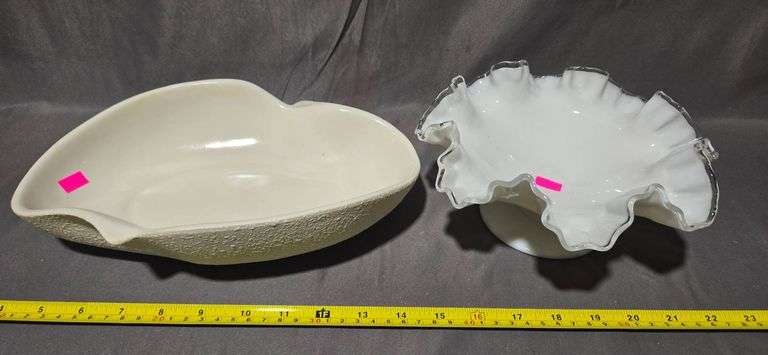 Two decorative bowls are included. The first is an off-white bowl marked ‘Originals C.S. Dish USA’ with a textured exterior and smooth interior. The second is a silver crested milk glass ruffled edge compote with a pedestal base.