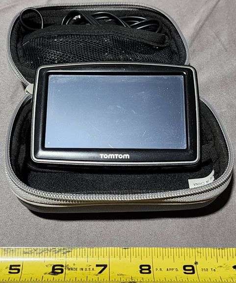 TomTom XL GPS device featuring a 4.3-inch display, compatible with various maps and navigation features. Includes the original carrying case and car charger cable. Model details: CN14644. The device remains untested.