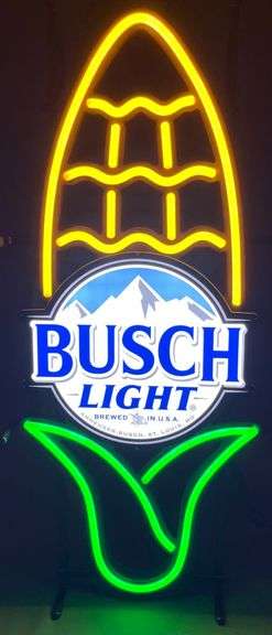 Busch Light branded neon light in the shape of an ear of corn. Constructed with bright yellow, green, and white neon tubing. The sign measures approximately 28 inches tall and 13 inches wide. Works