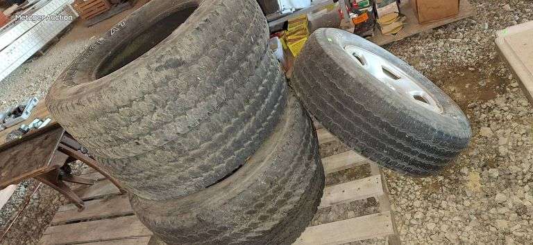 Five used tires, size 235x70r17, accompanied by one aluminum rim. The tires include various tread conditions and signs of wear. The aluminum rim features a five-lug pattern.