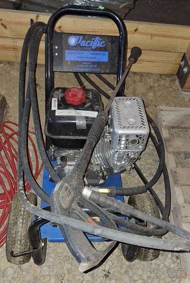 Pacific Equipment heavy duty commercial power washer with a 2000 psi rating at 2.5 gallons per minute. Features a robust frame, wheels for mobility, and included hoses. Powered by a compact engine suitable for heavy-duty cleaning tasks.