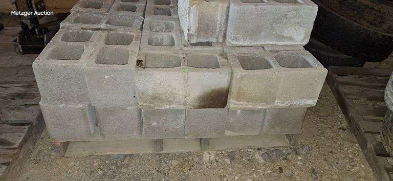 Pallet of concrete cinder blocks, consisting of multiple pieces. Each block features the standard hollow design and is constructed for durability. Blocks are stacked and arranged on a wood pallet for easy transport. Great for construction or landscaping purposes.