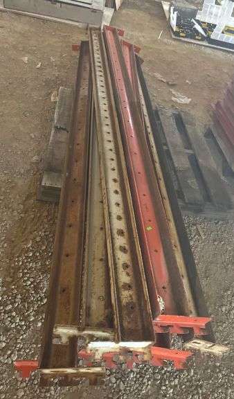 A set of heavy-duty metal shelving pallet rack supports, each measuring 9 feet in length. These supports are constructed from durable, industrial-grade metal and feature red and rusted finishes from prior use. Ideal for structural reinforcement applications.