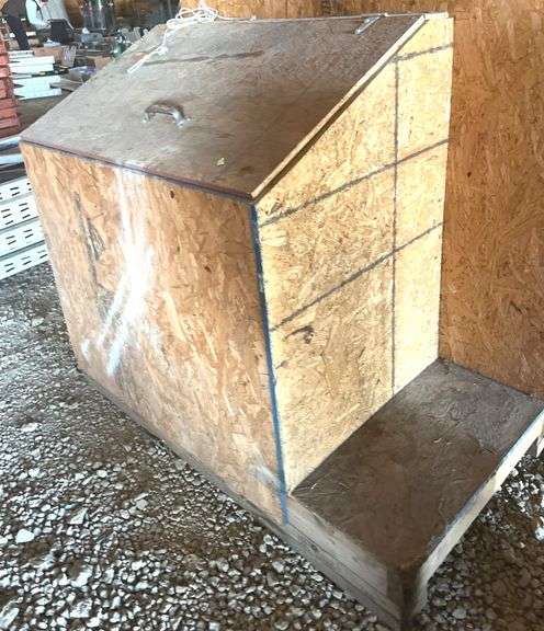 A storage closet constructed from oriented strand board (OSB), measuring 48x77x98 inches. Features a spacious, enclosed design with two hanging rods inside for organization. Additionally includes a separate OSB unit suitable for alternate storage purposes. Both units show signs of prior use and are structurally functional. Ideal for utility or storage solutions.
