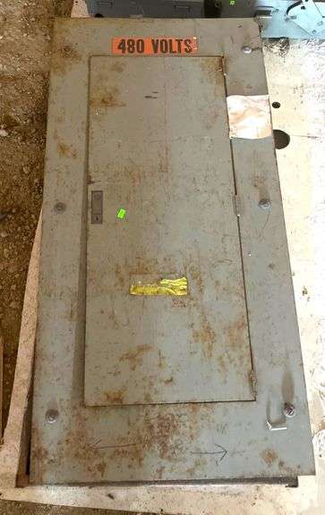 Industrial-grade electrical panel with a 480 volts capacity, featuring a main breaker and multiple circuit slots. The unit is encased in a metal housing with dimensions of 46x22.