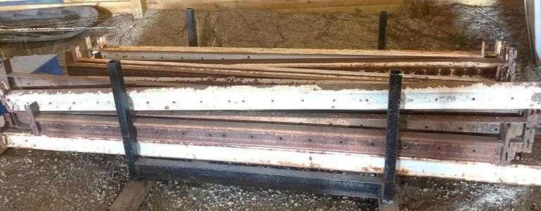 Approximately 25 steel pallet racking cross bars, each measuring 9 feet in length. Visible rust and wear.