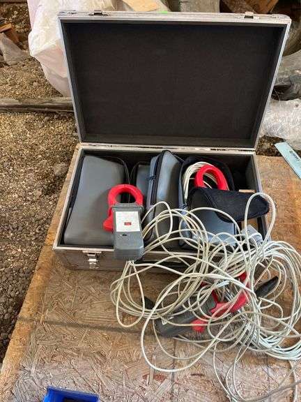 Set of six pieces of electrical testing equipment, including clamp meters and accessories, housed in a compact, lockable hard case. Components are marked with specifications, such as a clamp meter made in Taiwan (Model 700435) and a pressure sensor labeled for 0-16 bar with output of 4-20 mA.