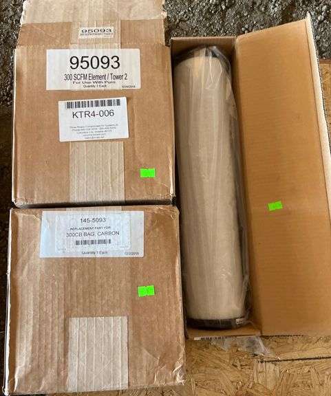 Includes four boxed replacement parts and filters for compressed air systems. Labels indicate compatibility with 300 SCFM systems and various models such as KTR4-006, KTR4-105B, and 300CB Bag Carbon.