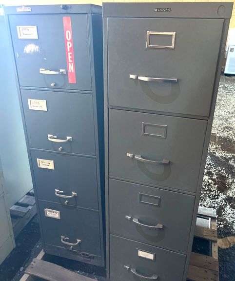 Two steel filing cabinets featuring four drawers each 29x15x52. One is from Anderson Hickey Co. and the other is a Master File by Art Steel Company, New York, USA.