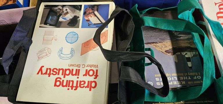 Collection of seven technical books including 'Drafting for Industry' by Wesley C. Benner, 'Programming Language C' (Second Edition), 'Electronic Principles' by Malvino, 'Keepers of the Light,' 'Automotive Encyclopedia,' 'Basic Television Principles and Servicing,' and 'Industrial Solid-State Electronics: Devices and Systems' by Timothy J. Maloney. Covers topics such as electronics, automotive principles, and programming. Books are hardcover and softcover editions.