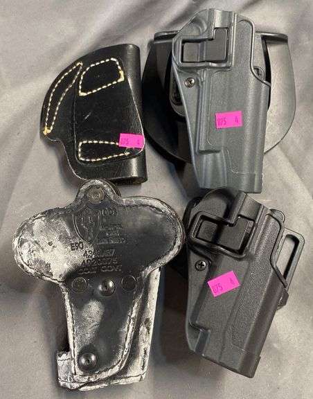 Four gun holsters made of black synthetic and leather materials. Includes Blackhawk model marked 'BLACKHAWK!' and Bianchi model marked 'Bianchi 08'. Designed for specific firearm fits, including markings for Colt Government. Features include molded construction, adjustable mechanisms, and visible stitching. Moderate wear visible on leather and light use on synthetic holsters.