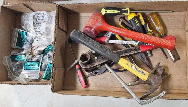 A mixed set of hand tools including hammers, screwdrivers, pliers, and cutting tools, alongside various electrical components such as 4-inch square covers, duplex, and GFCI fittings. Also includes plastic-packed dipper swivels labeled ‘American Made. Electrical components are packaged and labeled.