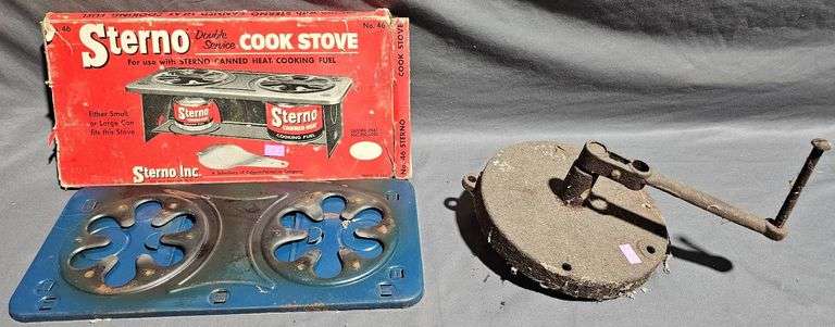 Includes a Sterno cook stove with a blue enameled metal base measuring approximately 13.5 inches in length. Accompanied by the original branded box. Also included is a hand-crank metal grinder with visible rusting and wear. Both items exhibit signs of use and age. Suitable for display or potential restoration.