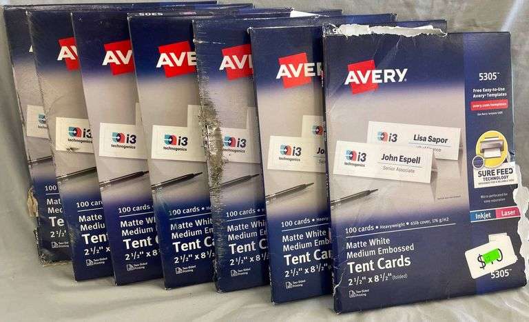 Seven packages of Avery Matte White Medium Embossed Tent Cards, product number 5305. Each package contains 100 heavyweight cards, measuring 2 1/2 in. x 8 1/2 in.