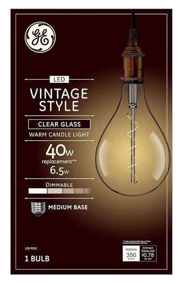 3 GE Lighting LED replacement lamps with clear glass and a medium base. Each bulb is 6.5 watts and designed as a 40-watt replacement. Model LED60PS52VS-C22K/CDN.