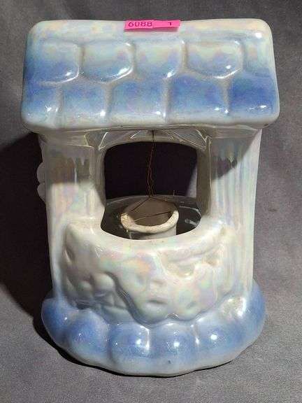 Ceramic figurine featuring a wishing well design with iridescent blue and white glaze. Includes a suspended bucket detail on wire within the structure. Adorned with floral accent detailing along the front. Measures approximately 3.5″ x 5″.