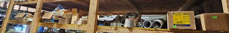 Variety of electrical supplies and components. Items include PVC conduit fittings, metal conduit elbows, wall plates, fastening clamps, and electrical switch plates. Brands such as Leviton and Carlton are visible.