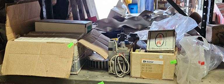 Group of industrial gas meter components and related items. Includes boxed valves, meters, wiring, and loose mechanical parts. Materials include metal and plastic.