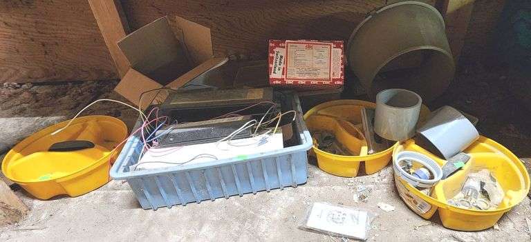 Electrical components including two fluorescent light ballasts with visible wiring and labels, various fixtures and wiring accessories in yellow plastic organizers, and a box containing plastic or metal mounting brackets.