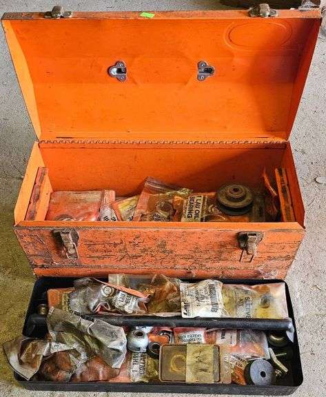 Metal toolbox measuring 20″ x 9″ x 9.5″. Features a hinged lid with latching mechanisms and a carrying handle. Contains various industrial components such as packaged bearings, a blower repair parts kit, and other mechanical items.