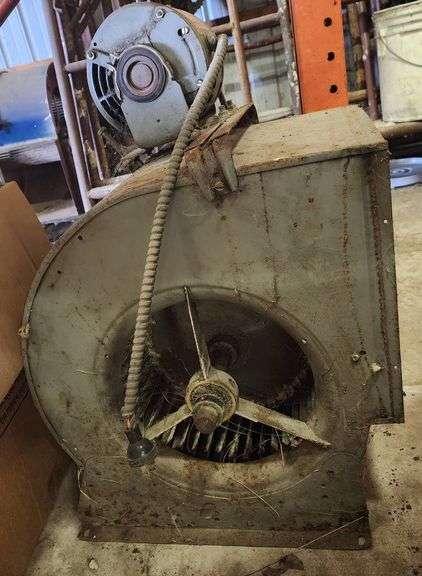 Dayton split phase A.C. motor attached to an industrial blower unit. Motor plate indicates Model E47498 with specifications including 1/4 HP, 1725 RPM, 115V, and 60 Hz. The blower is housed in a metal enclosure with dimensions 13.5″ x 19″ x 29″. Exhibits surface wear and residue from prior use.
