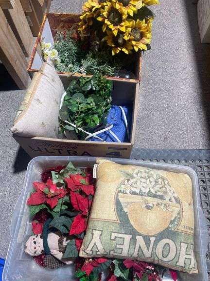 A selection of faux floral arrangements, including sunflowers, poinsettias, and other greenery, housed in containers. Includes a fabric pillow with a printed ‘Honey’ design and a small fabric snowman figure.