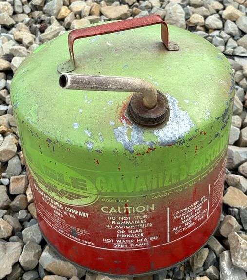 Eagle galvanized steel safety gasoline can, model SP-6, with a 2.5-gallon capacity. Features a red lower body, green upper body, built-in pour spout, and top handle for portability. Manufacturer information and safety warnings printed on the body. Visible signs of wear and surface rust are present, with paint loss due to age and use.