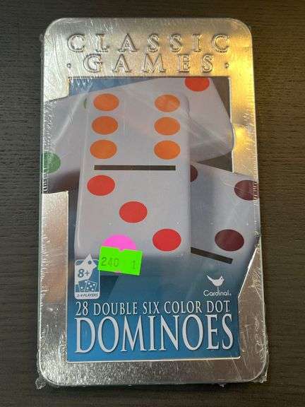 A tin set of 28 Double Six Color Dot Dominoes by Cardinal. The dominoes feature colorful, six-color dots for easy recognition. Packaged in a durable metal tin for storage, the set is designed for convenient play and organization. The packaging indicates the product is new and sealed.