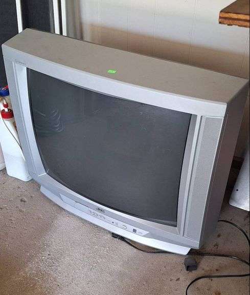 27-inch CRT television featuring a gray plastic casing with integrated speakers on either side of the screen. Equipped with a control panel on the lower front, and a power cable is included.