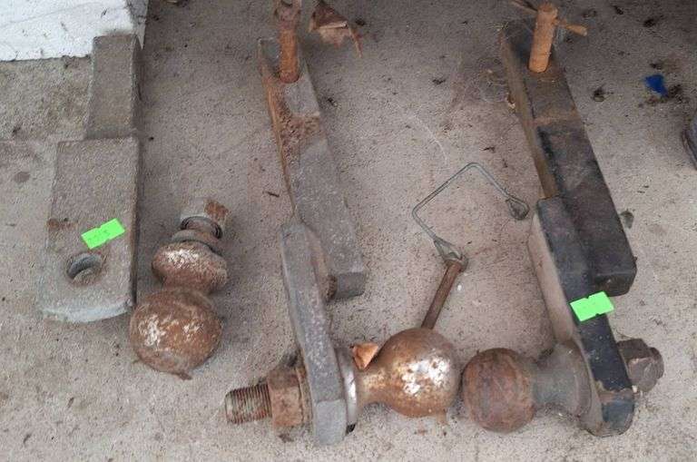 Hitch inserts featuring 1-inch mounts. Includes ball sizes of 1 7/8 inches and 2 inches. Metal construction with visible wear and rust. Parts include adjustable and fixed hitch designs with attached towing balls.