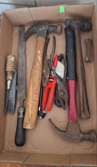 Boxed lot of assorted hand tools, including two claw hammers with wooden and rubber grips, a ball-peen hammer, a metal file, needle-nose pliers with red grips, a utility knife with replaceable blade, and other miscellaneous items.