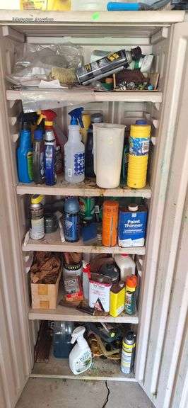 Tall plastic storage cabinet measuring approximately 24x66x16 inches. The cabinet features two vertical doors with integrated handles and includes multiple shelves containing assorted partial chemicals, cleaning supplies, and miscellaneous items such as paint thinner, weed preventer, cleaning vinegar, and spray bottles.