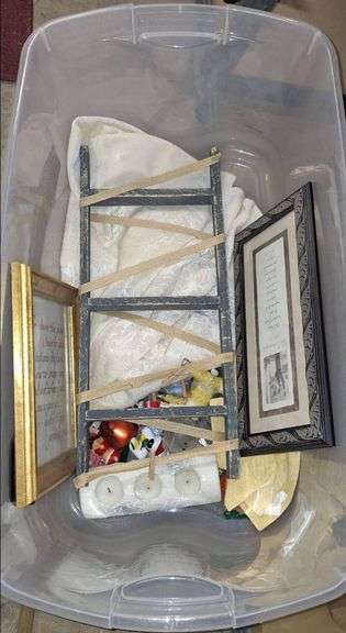 A clear plastic storage bin measuring approximately 30x18x16 containing framed wall art with religious inscriptions, a decorative ladder tied with rope, assorted holiday-themed ornaments and decorations, and candles. The bin is equipped with a snap-on lid and shows handling wear.