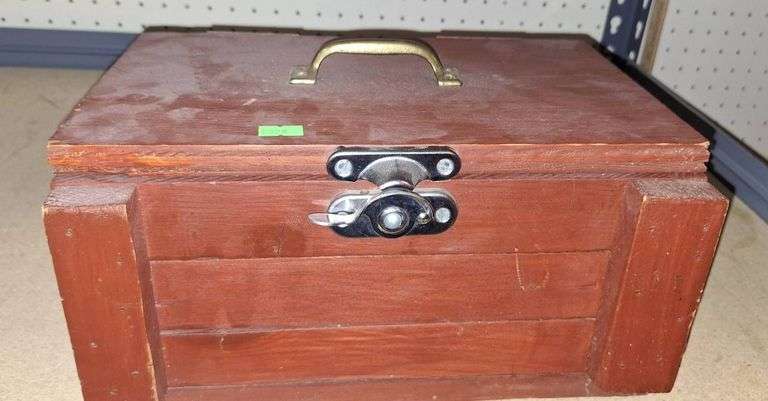 Lidded box constructed from reddish-brown wooden panels, measuring approximately 12.5×9.5×7 inches. Features a brass-tone handle on the lid, a front latch with a hasp locking mechanism, and metal hinges securing the lid. The interior is open and unlined.