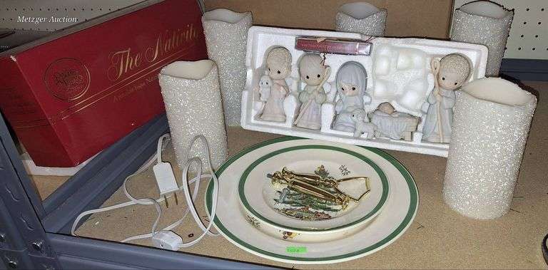 A Precious Moments nativity set with five porcelain figurines, including a baby in a manger and accompanying figures. Comes with ceramic plates featuring a Christmas-themed design and marked underside. Includes glittered electric candle decorations with power cords and switches.