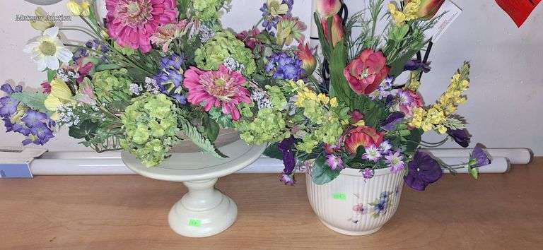 Artificial floral arrangements featuring mixed flowers in vibrant colors. One arrangement is housed in a Wicklow Vale Ireland ceramic compote-style planter with a pedestal base; the other is in a floral-patterned ceramic vase. Artificial flowers display varied textures and colors, creating a lush presentation.