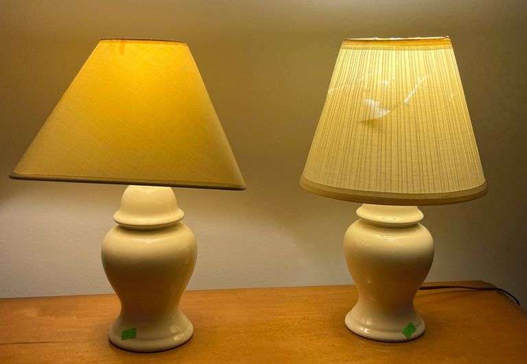 Table lamps featuring ceramic vase-shaped bases in a cream finish, each with a different tapered fabric shade. One shade has a smooth opaque surface while the other is pleated. Each lamp measures approximately 15 inches in height.