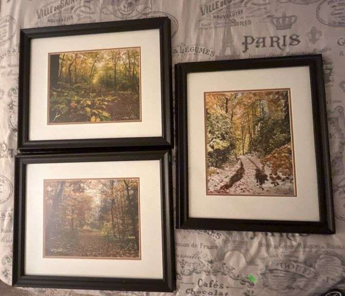 Three framed prints featuring nature scenes attributed to photographers Nancy May and Robert Ljerstrom. Each print measures 19x22 1/2 inches, with autumnal and forest themes depicted. Two works are labeled as Nancy May, and one as Robert Ljerstrom, with artist signatures visible on the prints. Frames have black finish and include matting. Printed artist informational sheets are fixed to the back of each frame.
