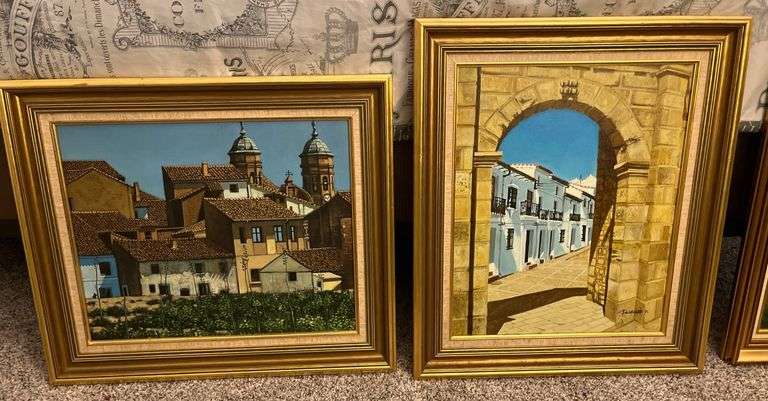 Signed oil paintings on canvas by J. de la Rola. The first depicts a townscape featuring terracotta-roofed buildings and church domes, signed and dated '86. The second shows a stone archway leading to a street scene with whitewashed buildings, signed and dated '81. Both works are housed in coordinating gold-toned frames, each measuring 23x20 inches. Wired for hanging with paper backings intact.