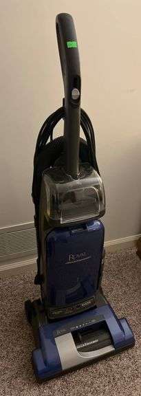 Royal Pro Series upright carpet cleaner with blue and gray exterior. Features include Clean Surge control, removable water tanks, and an ergonomic handle with cord storage. The cleaner is designed for deep-cleaning carpets and is equipped with adjustable cleaning settings.
