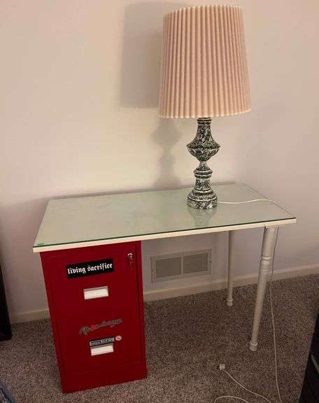 Desk featuring a glass top measuring 41 1/2 x 19 1/2 inches, supported by a red metal two-drawer filing cabinet with decals and a locking mechanism, alongside two white legs. Includes a table lamp measuring 32 inches tall, with a marbled finish on the base and a pleated beige fabric shade.